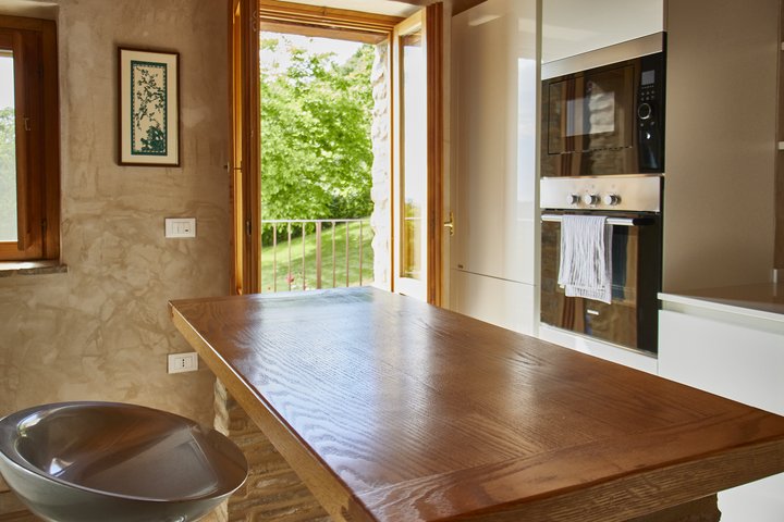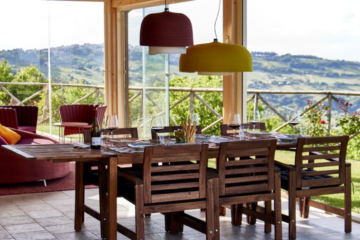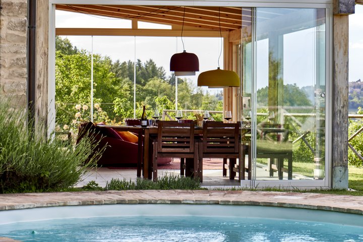 Het typische zandstenen huis met zwembad ligt tussen de glooiende heuvels van de Verdicchio in de regio Marche in Italië.